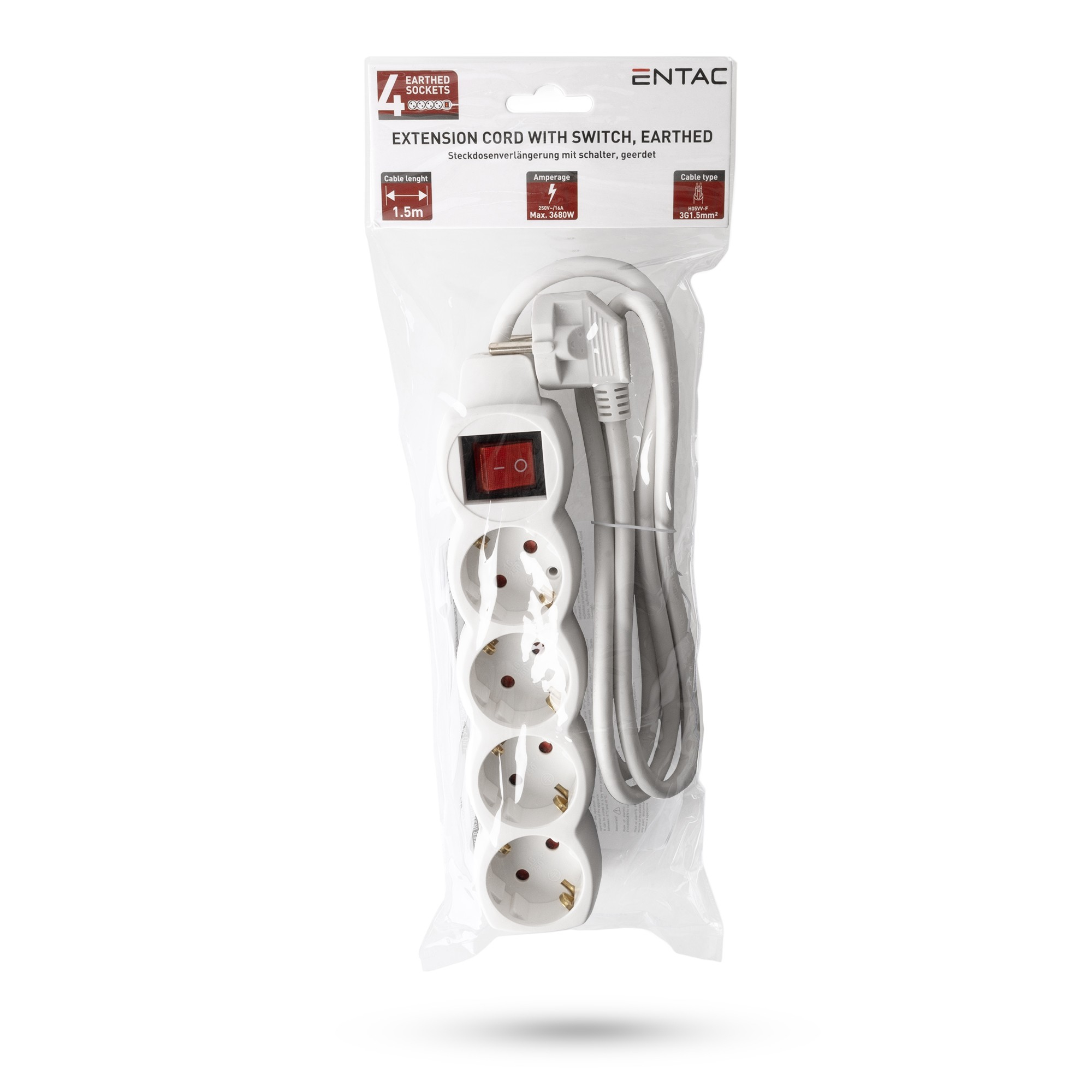 Global manufacturer supportThe Entac socket extension with switches are indispensable both at work and home. With their help you can provide electricity for all of your electric devices even if the power source is located further away in the room. Our range includes earthed socket strips with 3 to 6 sockets, 3G1.0 cable type in 1.5, 3 and 5 m lengths, as well as 3G1.5 cable type in 1.5 and 3 meter lengths. With the help of the switch you can disconnect your devices without unplugging them from the power strip.