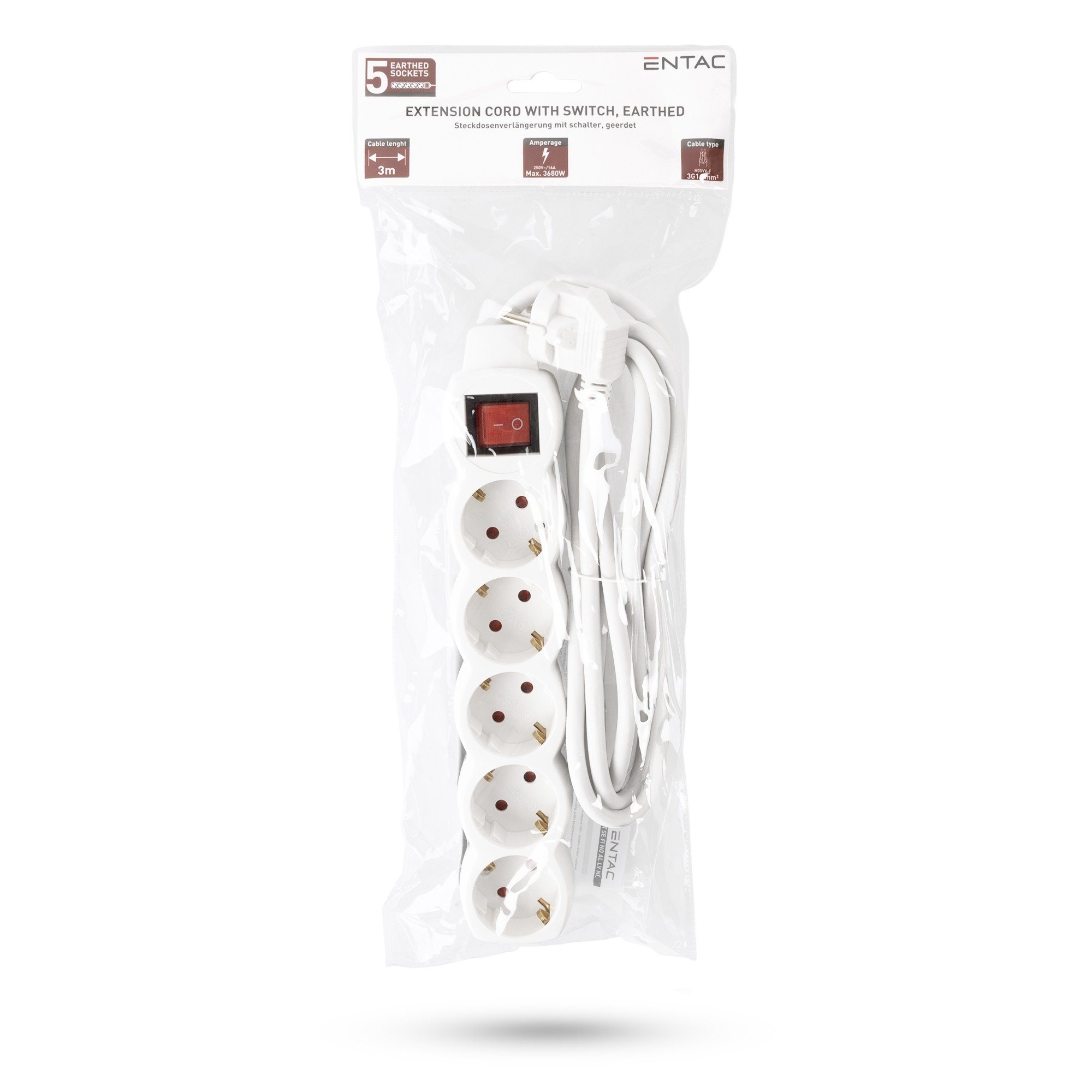 The Entac socket extension with switches are indispensable both at work and home. With their help you can provide electricity for all of your electric devices even if the power source is located further away in the room. Our range includes earthed socket strips with 3 to 6 sockets, 3G1.0 cable type in 1.5, 3 and 5 m lengths, as well as 3G1.5 cable type in 1.5 and 3 meter lengths. With the help of the switch you can disconnect your devices without unplugging them from the power strip.